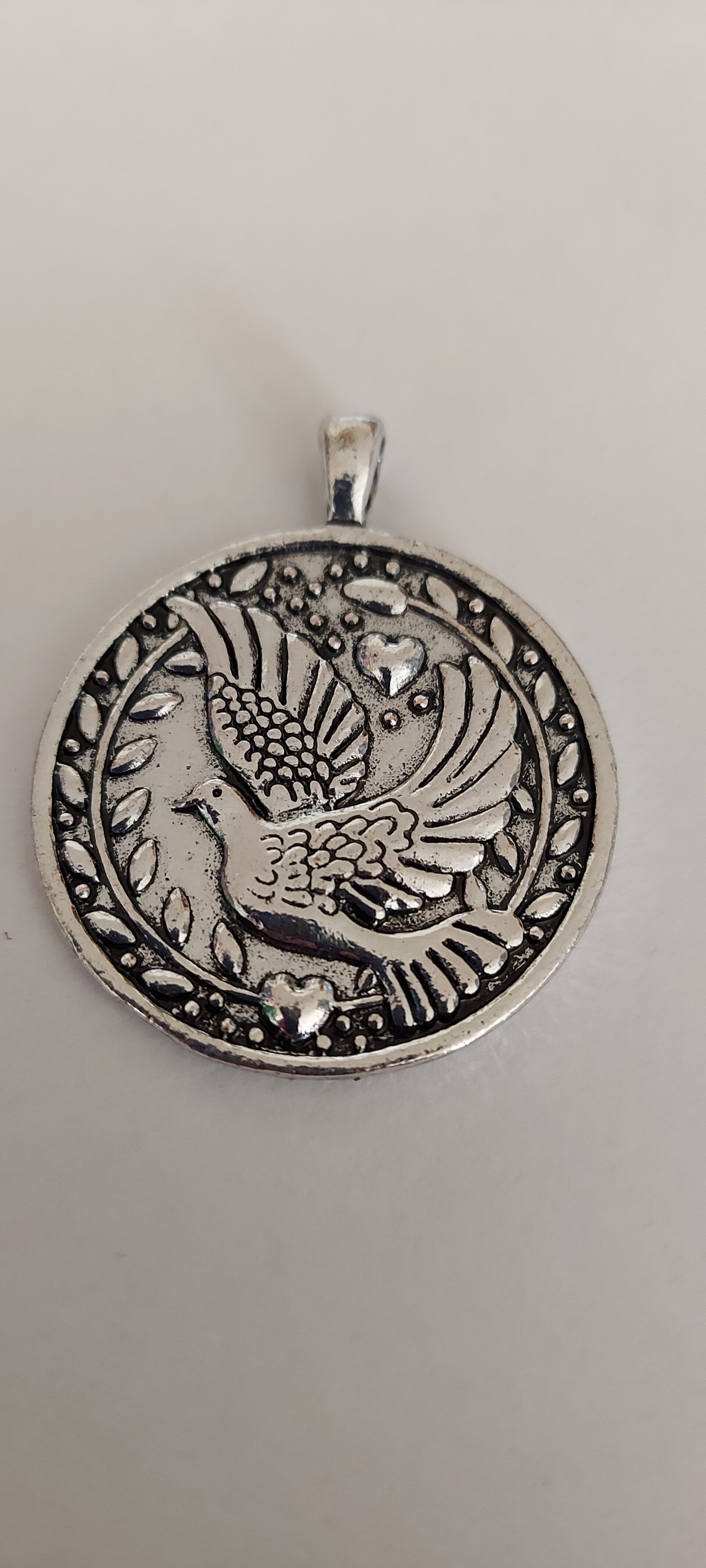 op de Amulet staat op beide zijde een vredesduif met hartjes.