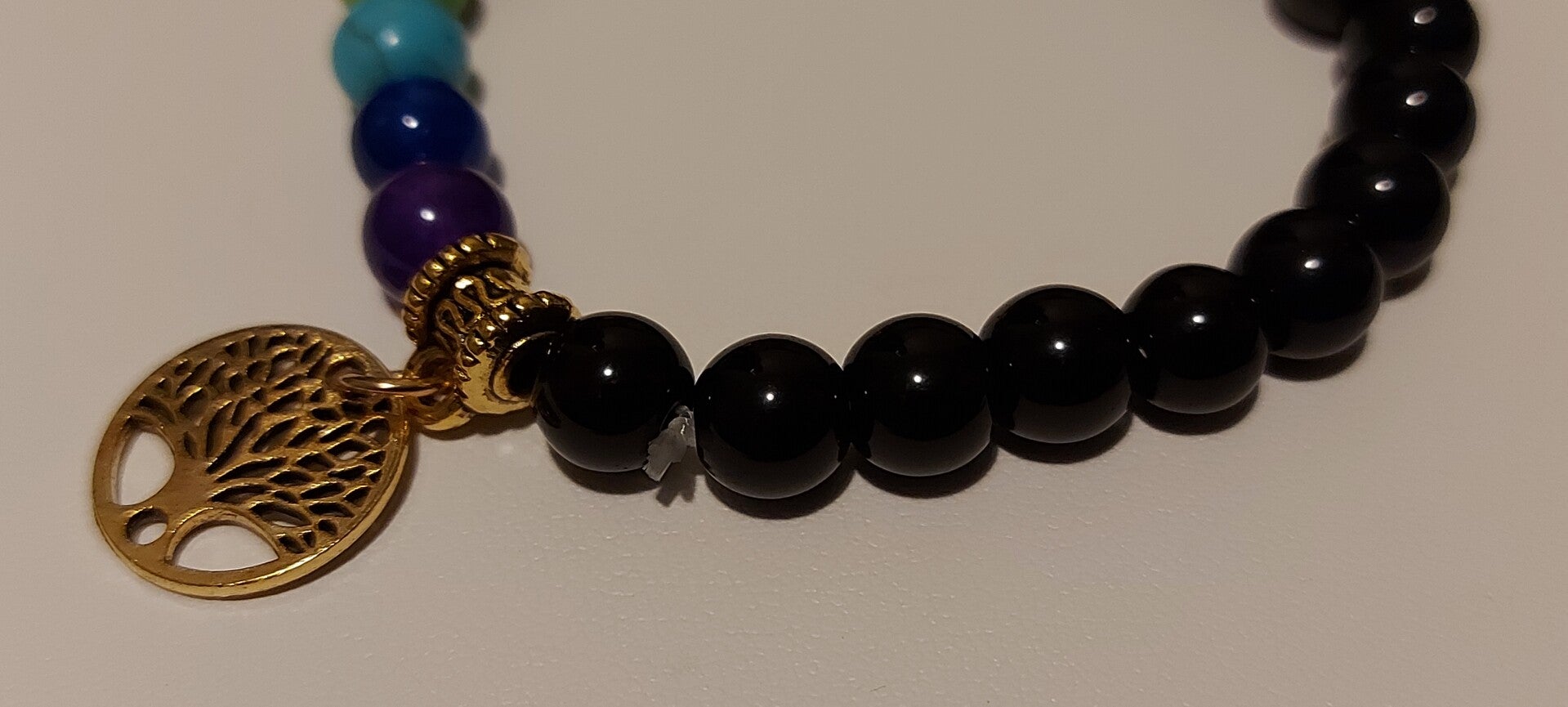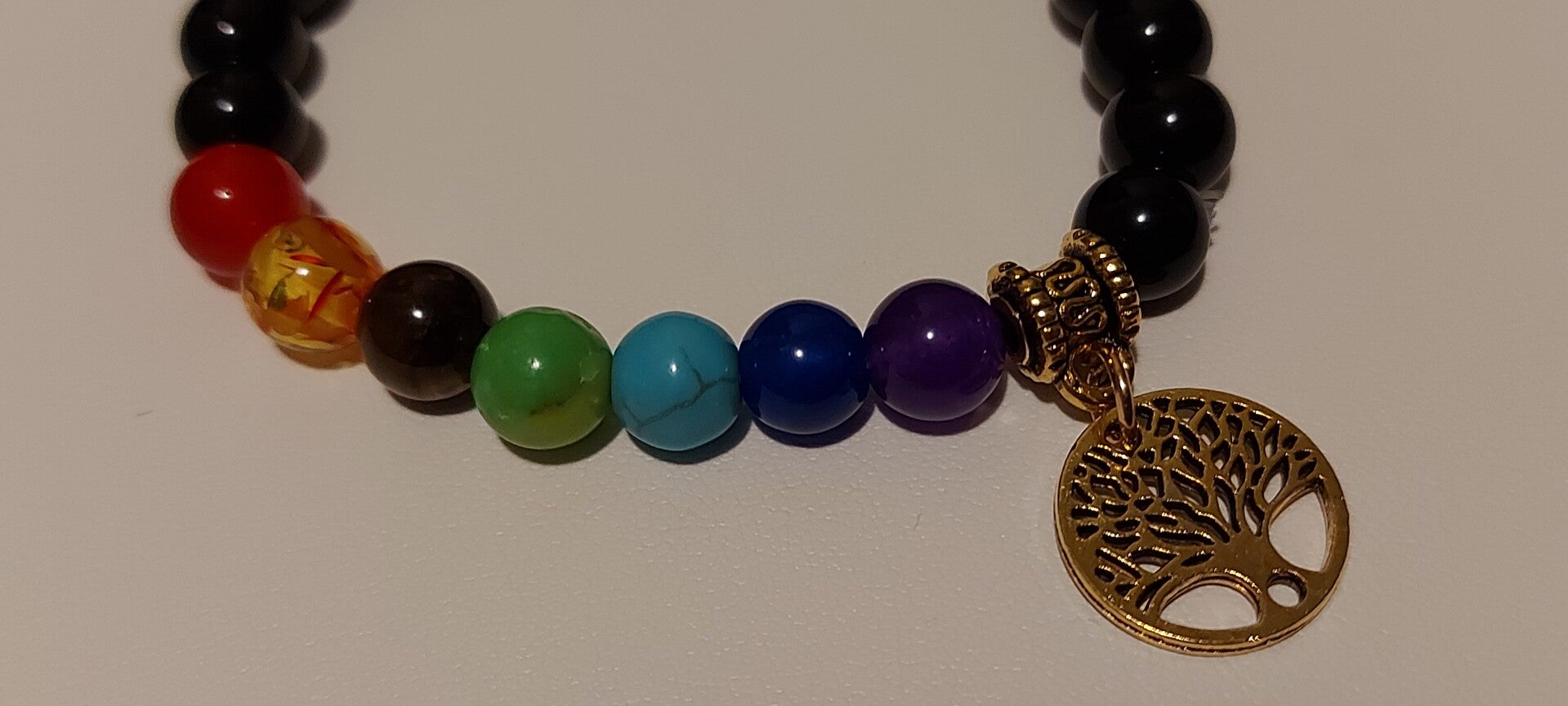 Deze armband heeft de 7 chakra stenen samen met Obsidiaan.