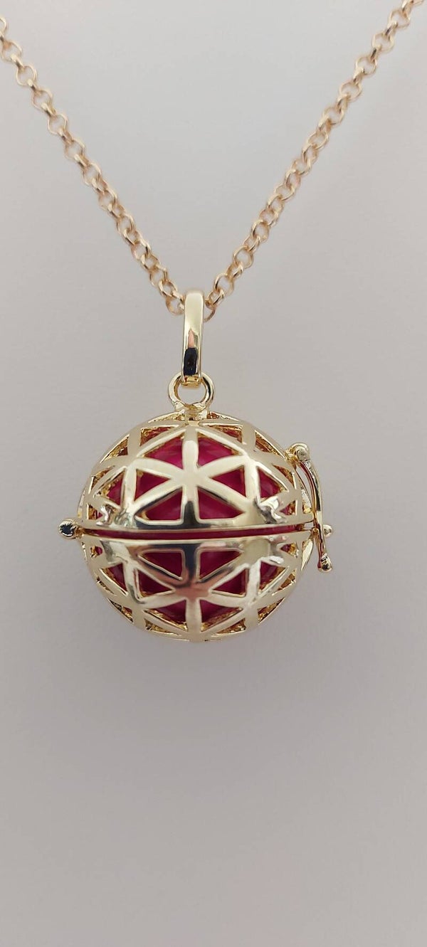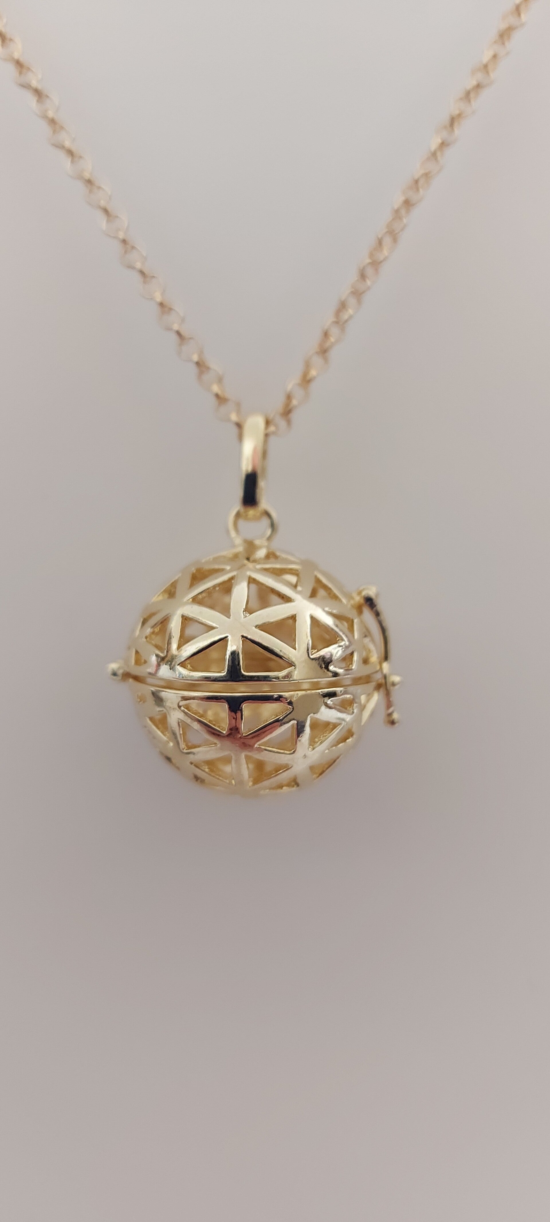 Deze engelen roeper is goud kleurig en in de vorm van een bol met bloem des levens, En is inclusief de ketting van ca 75cm